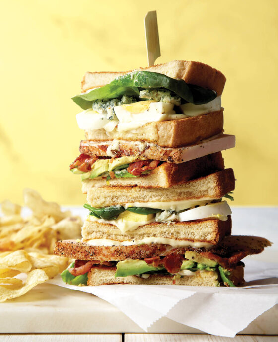 Repeat with the second bread slice and add sliced eggs and blue cheese. Carefully place the second stack on top of the first, turkey side up. Cover with the third bread slice, mayonnaise side down.