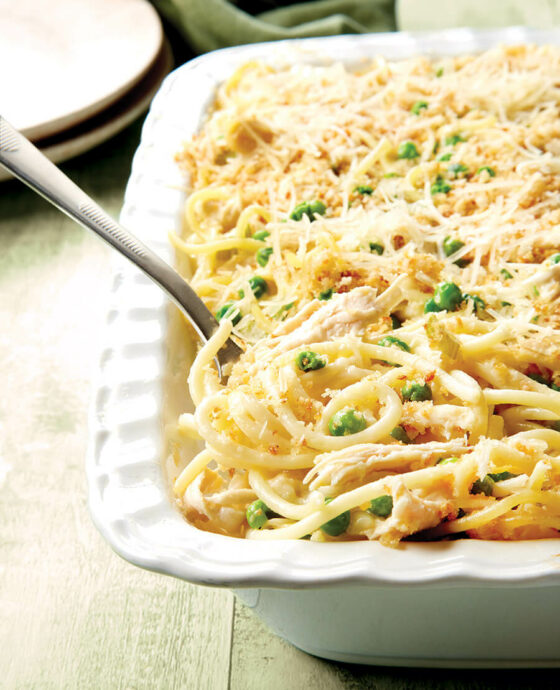 Add turkey, spaghetti, and frozen peas. Add more salt and pepper to taste, if desired. Transfer pasta mixture to prepared casserole dish.