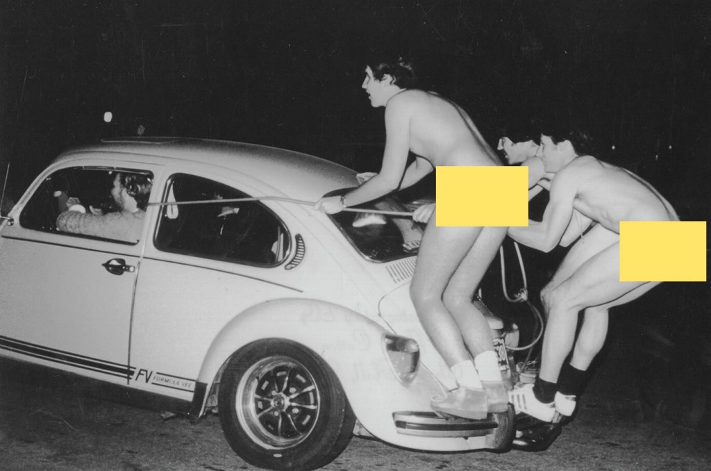 Streakers who wanted a quick getaway opted for motorized transportation. At UNC, that meant hitching a ride on a friend’s bumper. photograph by North Carolina Collection, University of North Carolina at Chapel Hill