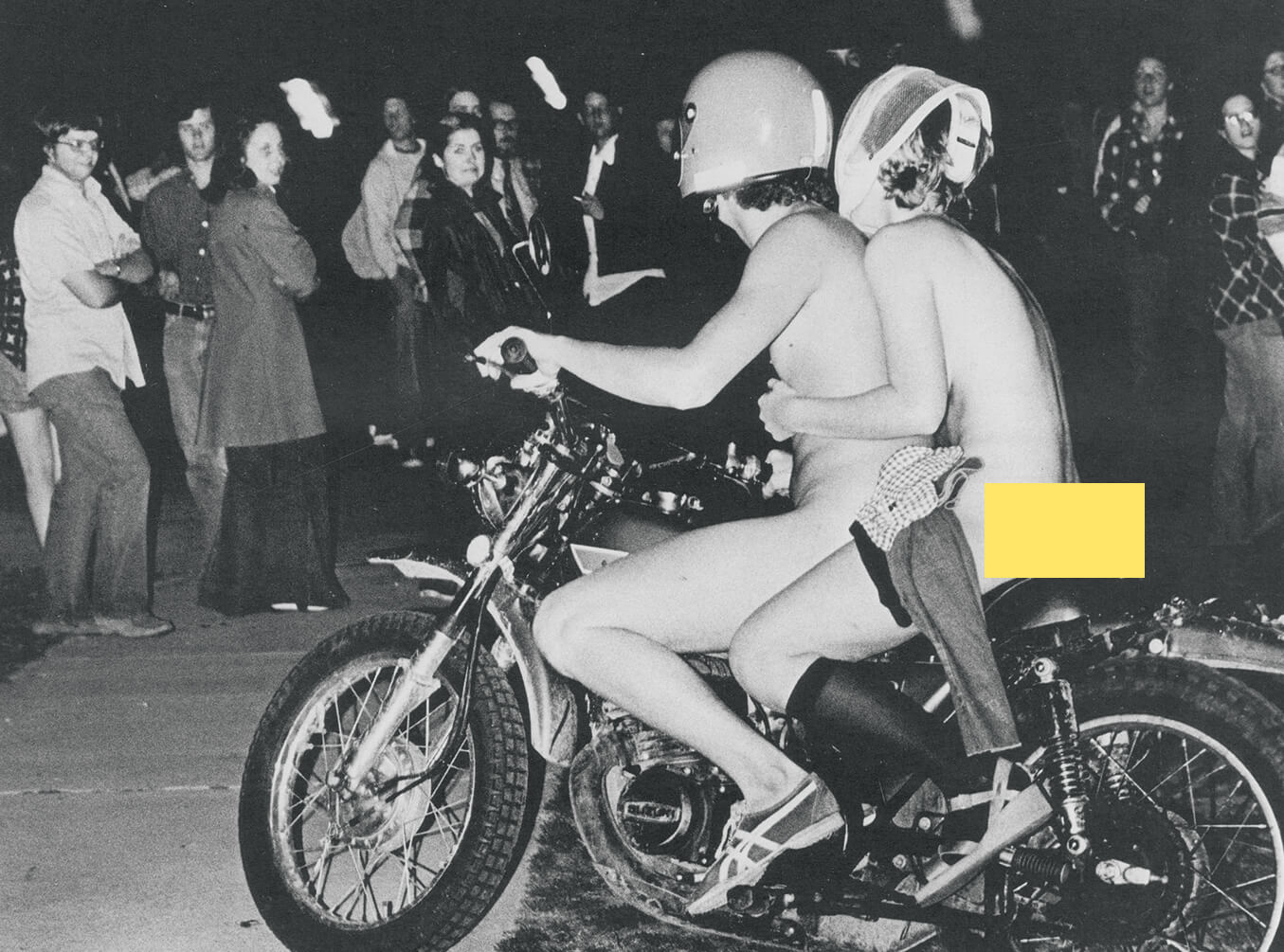 The 1974 edition of the UNCG yearbook, Pine Needles, boasted their streak had “the greatest number of miles streaked on a motorcycle by a couple.” photograph by William E. Hunt, Courtesy of The Martha Blakeney Hodges Special Collections and University Archives, The University of North Carolina at Greensboro
