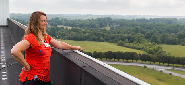 Kaye Flippin, a 35-year Unifi employee, looks north from the factory’s roof. As plant manager of spinning, she played a crucial role in bringing Repreve into existence. photograph by Joey Seawell