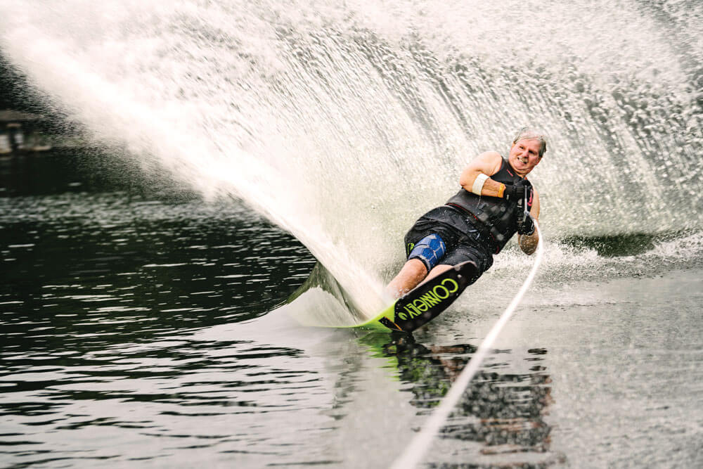 Lewis Fields, with mussed gray hair, a trimmed mustache, bifocals, and a stilted gait, walks down a concrete path toward the dock. It’s a cool morning. Six a.m. Quiet. The water is nearly still. Lewis tosses a few things into his speedboat: life jacket, knee brace, back brace, a single ski. “More equipment than a hockey player,” he says. He pushes a lever, lowers the boat into the water, and kicks on the motor, the noise gurgling through the boggy air.