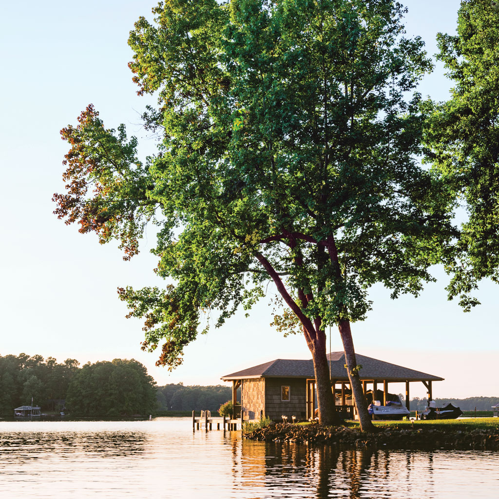 Lewis Fields’s boathouse, in the Lizard Creek cove. Many of the boat lifts on the lake were built by his company, Doozie Boat Lifts. photograph by Andrew Kornylak