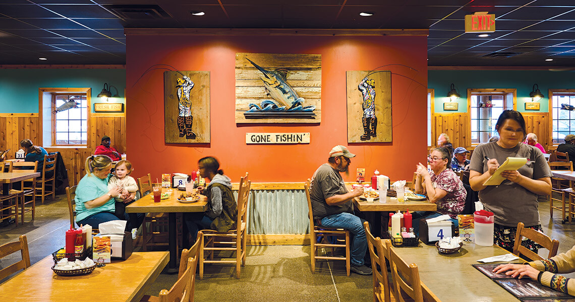 Although Walkertown Seafood Shack sits three and a half hours from the coast, the restaurant’s bright, aquatic-themed interior and the scent of fried fish transport diners right to the beach. photograph by Dhanraj Emanuel
