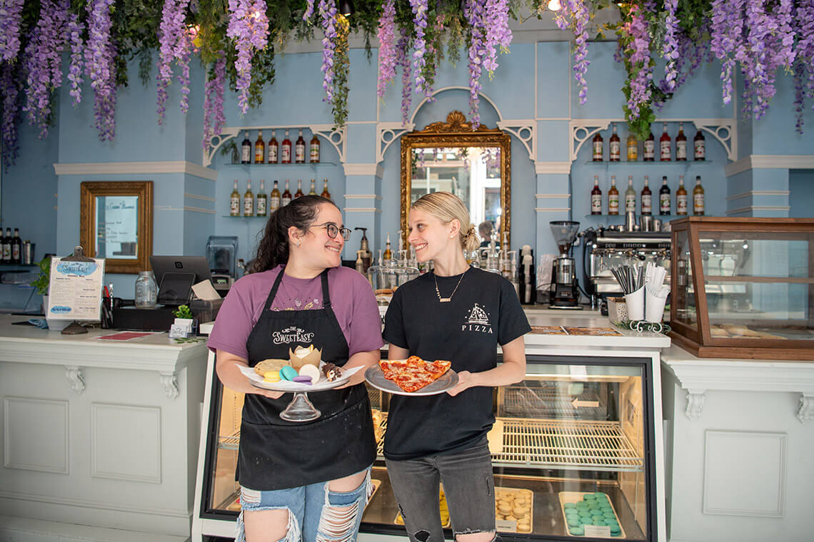 Whether you prefer a colorful macaron or cheesy slice of pizza, you can satisfy sweet and savory preferences between the side-by-side Sweet Easy and Elizabeth City Pizza Company. photograph by Katie Myrick Photography
