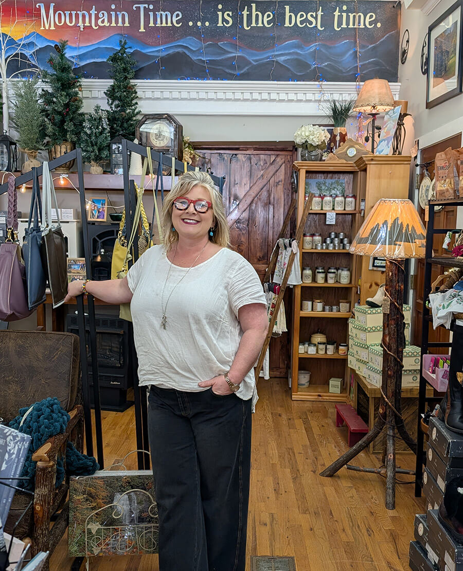 Claudia Honeycutt welcomes visitors to her Burnsville shop, Mountain Time on Main Street. photograph by Sue Wasserman/Explore Burnsville