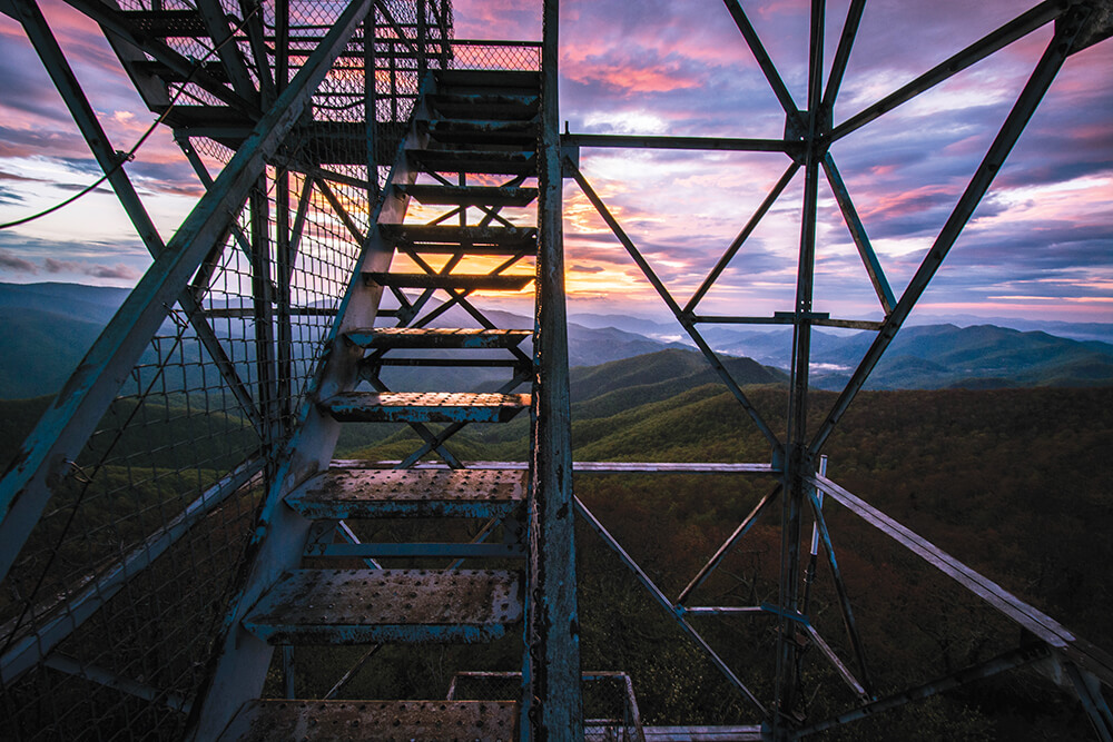 Fryingpan tower, just off the Blue Ridge Parkway near Brevard, was partially restored in 2008, and dazzles hikers with views of Cold Mountain and Pink Beds. photograph by Andy Toms