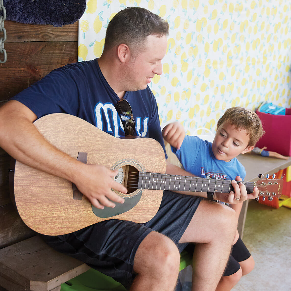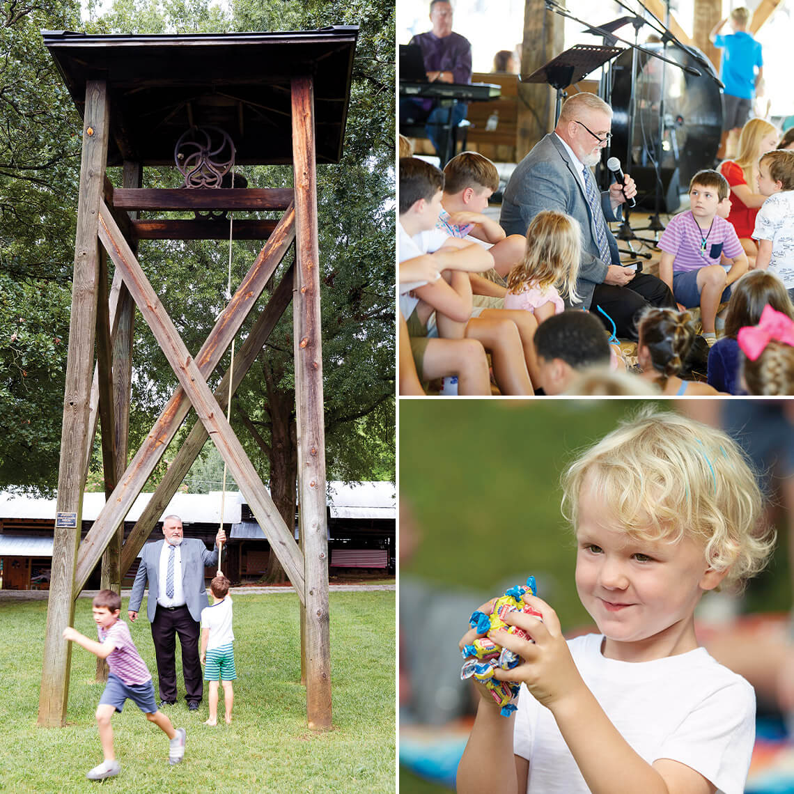 Jay Sigmon enlists some of Rock Spring’s kids to help him ring the bell for worship services; leads worship; and hands out treats to happy campers like Taft Ferrell. photograph by Stacey Van Berkel