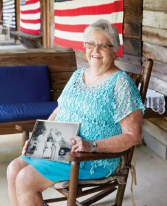 On the front porch of Tent 131, Pinkie Taylor shows off an old family photo. photograph by Stacey Van Berkel