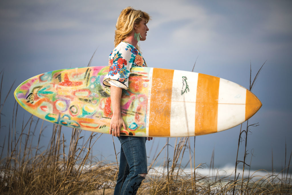 Artist and surfer Dawn Gray Moraga uses boards as her canvas. Her designs are on display in the waves near her home in Kill Devil Hills. photograph by Chris Hannant