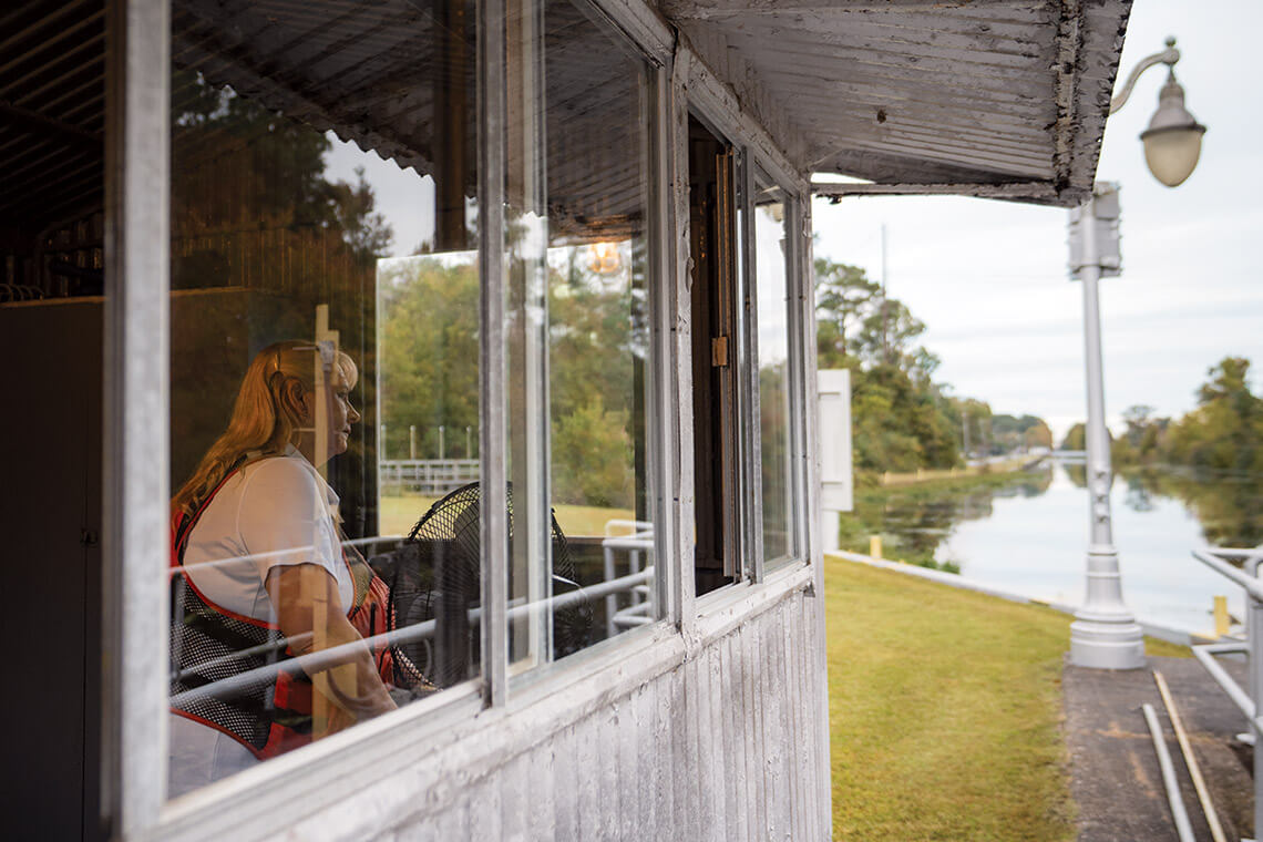 Lockmaster Tammy Barnes operates the South Mills lock along the Dismal Swamp Canal, welcoming boaters traveling between North Carolina and Virginia. photograph by Chris Hannant