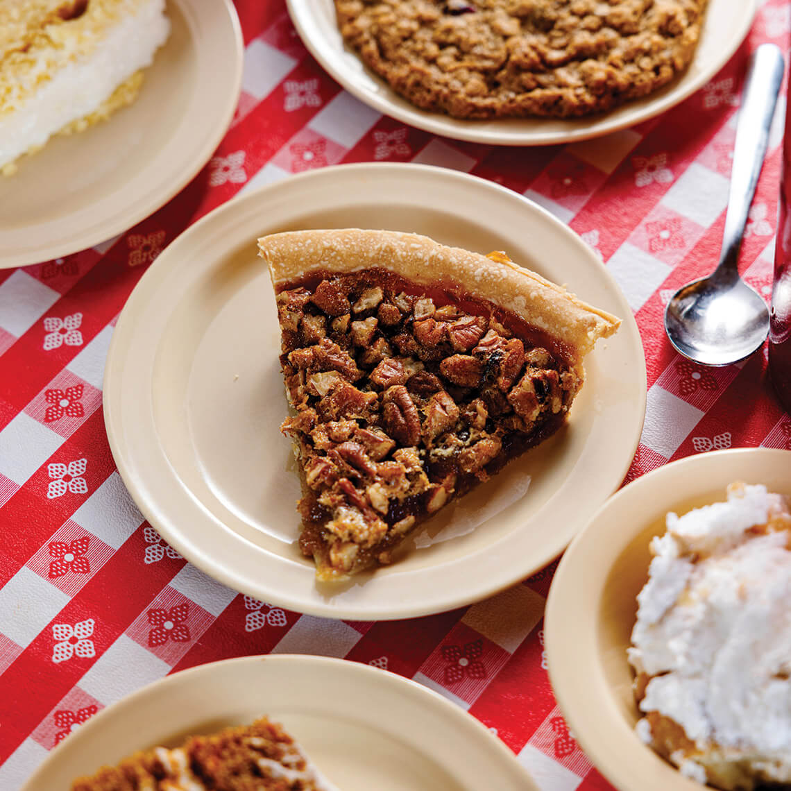 “Pecan pie, buttermilk pie, coconut cake, carrot cake, banana pudding, and our Wilber’s cookie,” Underwood says. Beside the names of the desserts hang prize ribbons from the Wayne County Fair. “The pecan pie and coconut cake won first,” he says. “The carrot cake took second, which I opened a full investigation into. It should have been first!”