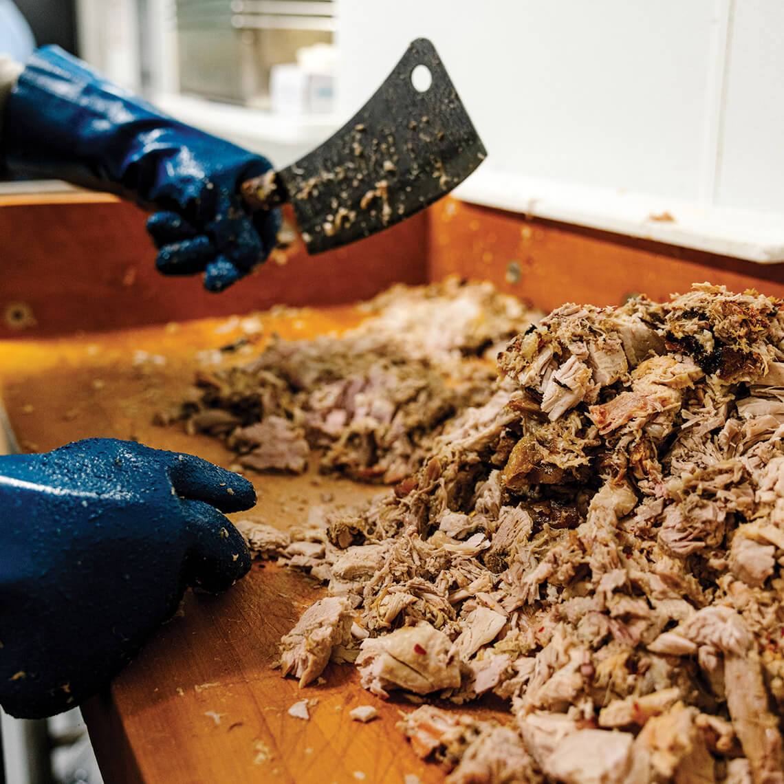 After 12 hours, Martin turns the pit over to Smith, who, like Martin, feels the hogs to know they’re ready. Smith turns the hogs over to let them cook a bit more, then he or Needham Herring chops pork for three hours a day on oak blocks. With a little vinegar and some spices, they transform the hunks of meat into tender eastern North Carolina barbecue that’s ready for plates and sandwiches.