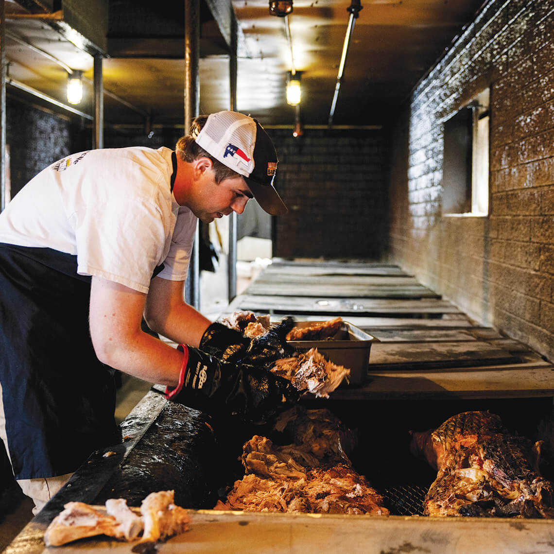 The morning shift — in this case, Willis B. Underwood IV, takes the pork out of the smoker after it’s cooked for more than 12 hours.<br><span class="photographer">photograph by Anna Routh Barzin</span>