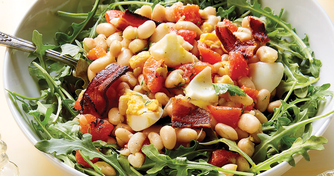 Place arugula in a large salad bowl or divide into 4 individual salad or pasta bowls. Top with egg mixture. Crumble bacon over top and serve.