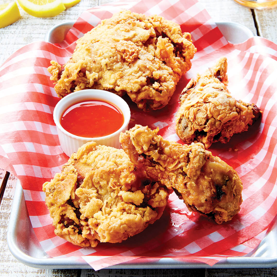 Remove chicken from brine. Dredge in flour mixture, shaking off excess. Dip in buttermilk, letting excess drip off. Dredge in flour mixture again, shaking off excess. Working in batches, fry chicken, turning 3 to 4 times, until golden brown and internal temperature reaches 165°, about 9 to 12 minutes. Let drain on paper towels. Serve immediately.
