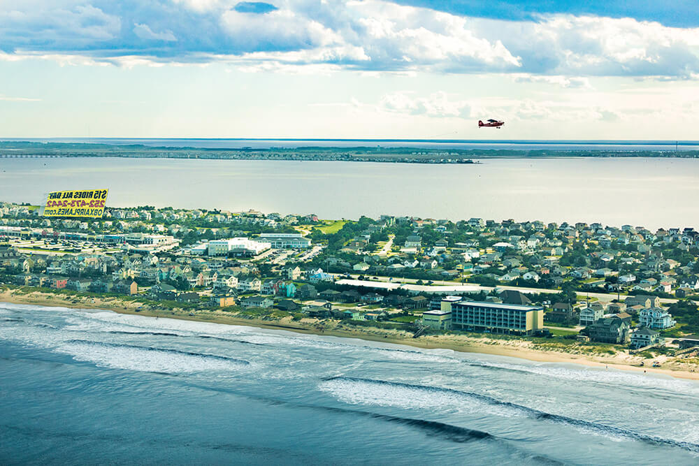 The OBX Airplanes ground crew, led by Jesse, is out in the airfield, laying banners across the grass. Jesse is lanky, long-haired, and tan, and, like his sister, he runs a tight ship. He waves his hand toward three banners. “These are too close together,” he says. “If a crosswind picks up and one gets caught on the other, the pilot will have to drop them immediately or risk crashing. It’s just science.”