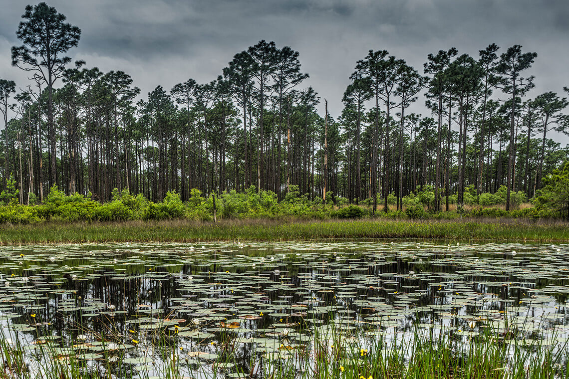 From Oyster Point, on the southeastern edge of Croatan National Forest, one can look across the Newport River — over alligator snouts poking above the brackish water — and see Morehead City in the distance. Oyster Point is the southern terminus of the easy, 20.4-mile Neusiok Trail, which traverses pine forests, hardwood ridges, cypress swamps, and pocosin bogs before reaching the Neuse River. The varied ecosystems teem with life, from the hard-to-find — like tiger salamanders hiding under logs in the pine forest — to the hard-to-miss, like loons calling out their mournful wails on the Neuse River. Along the trail, hikers can see old tar kilns — mounds of dirt that seem out of place in the flat landscape — and derelict moonshine stills, vestiges of human settlement in a place that is otherwise so wild. — Rebecca Woltz