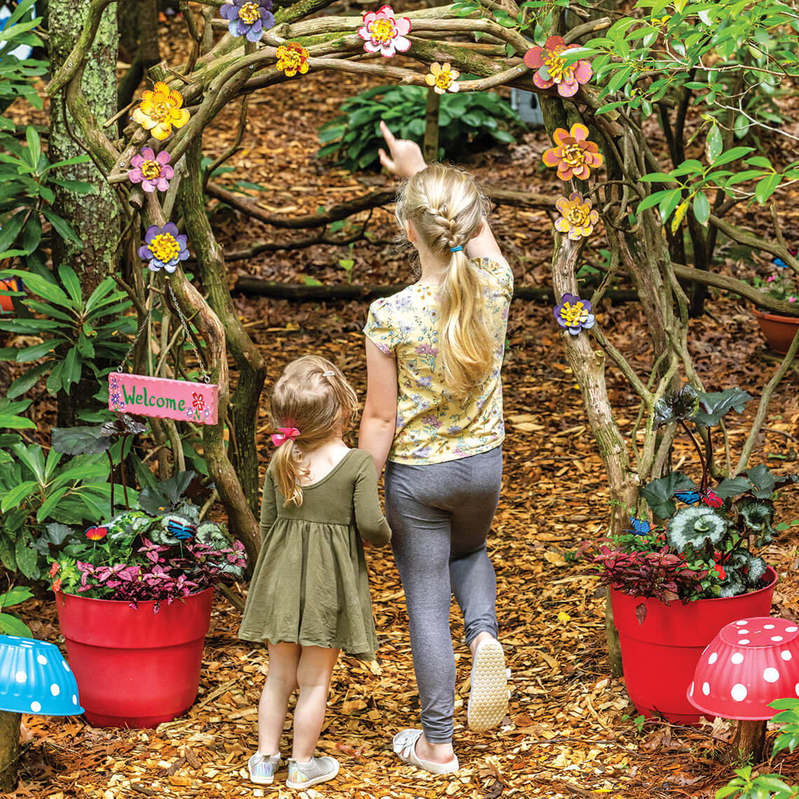 Sisters Tessa, 3, and Lily, 8, search for tiny fairies in miniature homes among the bright blossoms — real and otherwise — and twisting branches of Bullington Gardens. photograph by Tim Robison