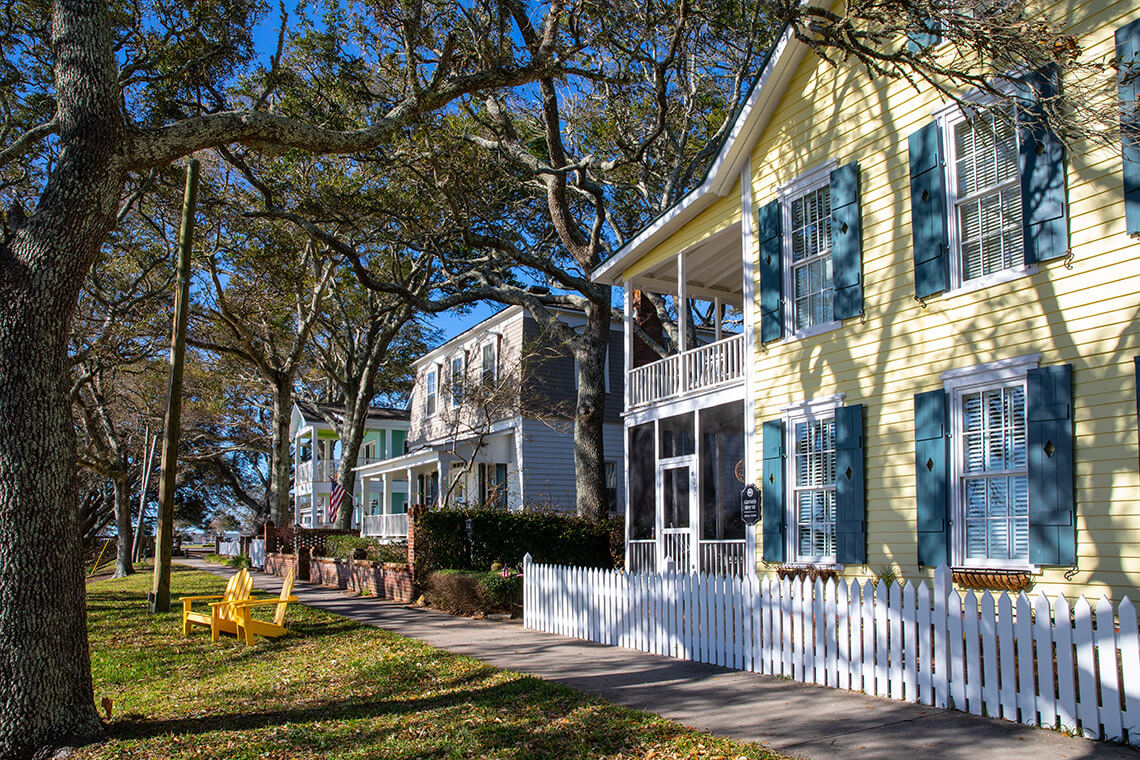 Stately homes, with porches angled to catch breezes off the river, line the picturesque streets around downtown Southport. Photography courtesy of NC’S BRUNSWICK ISLANDS