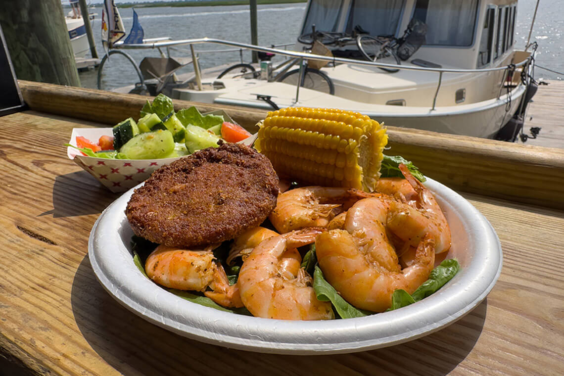 For a true Southport experience, take a seat on the docks and dig into local shrimp and fried crab cakes from The Provision Company.<br><span class="photographer">Photography courtesy of NC’S BRUNSWICK ISLANDS</span>