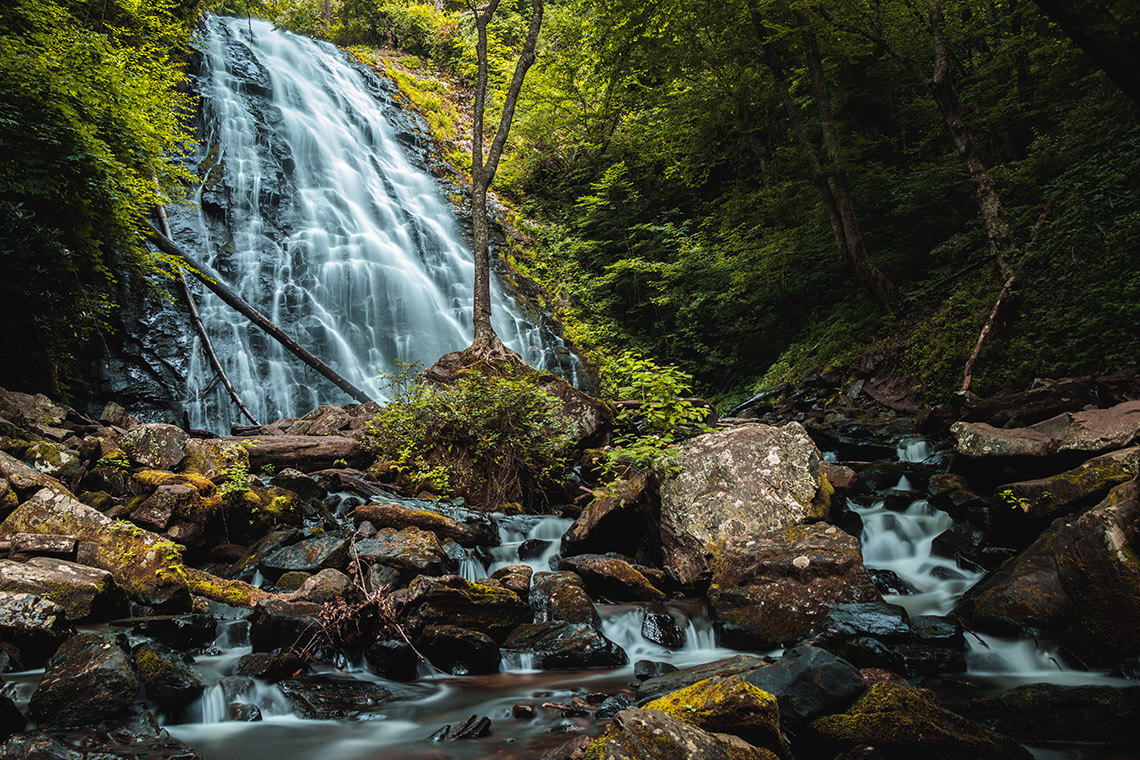 A 2.5-mile loop trail to Crabtree Falls takes hikers through rhododendron thickets. A bridge over the creek in front of the falls offers the best view. photograph by Juan Sebastian Charria/iStock/Getty Images Plus