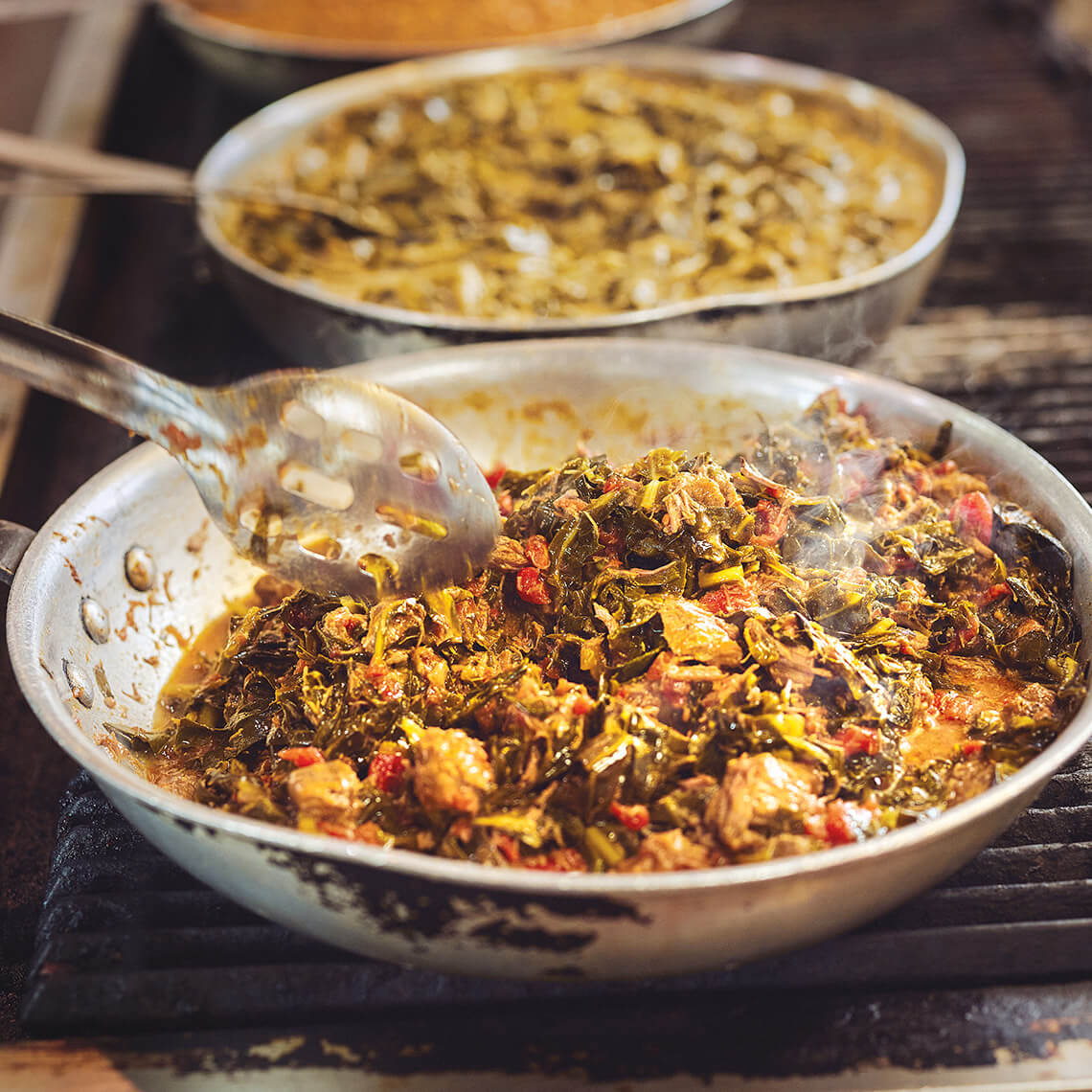 Take a peek in the kitchen, and you’ll find Sonya Jackson heating beef-and-collard stew that’ll be served with sadza, a Zimbabwean porridge; peanut-butter-based dovi chicken; and chakalaka. photograph by Alex Boerner
